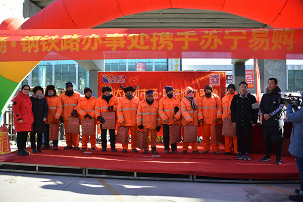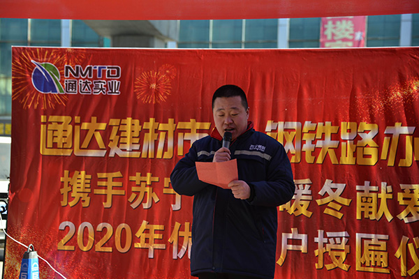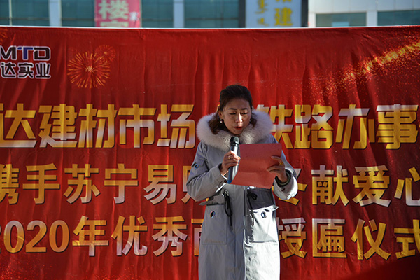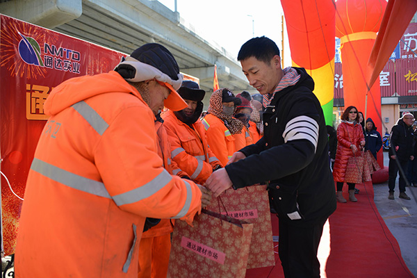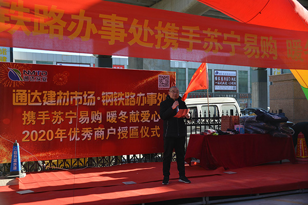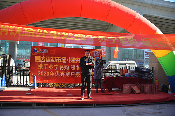 2020年11月29日舉行了通達(dá)建材市場2020年暖冬活動以及優(yōu)秀商戶授匾儀式。整體活動分為三部分,1.由市場主導(dǎo)定制沖鋒衣,蘇寧易購出資,共同為市場以及周邊裝卸工提供暖冬定制沖鋒衣。2.聯(lián)合鋼鐵路辦事處,召集周邊環(huán)衛(wèi)工人,發(fā)放采購好的保暖 慰問品和定制水杯。3.公布優(yōu)秀商戶名單,并進(jìn)行授匾儀式。王總在活動當(dāng)中講到“我們要共同努力克服每一個困難,只要路的對的,就不怕路遠(yuǎn)”樹立了商戶對未來的信心。整體過程由首府直通車全程參與,活動期間鋼鐵路辦事處領(lǐng)導(dǎo)的講 話也是非常認(rèn)可我們建材市場的工作。