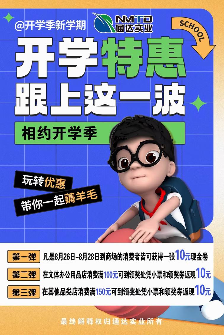 9月臨近,又迎來一年開學(xué)的日子。每一年的開學(xué),令眾多學(xué)子向往,充滿希翼和對(duì)未知的渴望,它開啟了童年、少年、青年的求知夢(mèng)想,記錄了稚嫩、豆蔻、青蔥的歲月年華。8月底,通達(dá)商場(chǎng)推出開學(xué)季促銷活動(dòng),全商場(chǎng)特賣一降到底,新學(xué)期用品推出特價(jià),為學(xué)子獻(xiàn)上開學(xué)大禮。