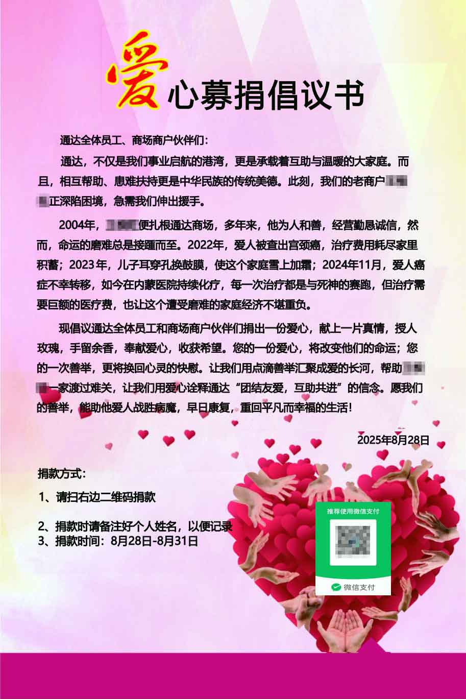 商場(chǎng)經(jīng)營(yíng)拓展部得知這個(gè)消息后,秉著“病魔無情人有情”和通達(dá)“互愛”的精神,向通達(dá)公司全體員工和商場(chǎng)商戶發(fā)出募捐倡議,號(hào)召大家伸出援助之手,共助W老板一家渡過難關(guān)。自8月28日愛心募捐書發(fā)出后,公司領(lǐng)導(dǎo)層率先垂范、帶頭捐款,各分公司員工也積極響應(yīng),無論是朝夕相處的商場(chǎng)員工和商戶,還是素未謀面的其他分公司員工,都紛紛踴躍加入,以實(shí)際行動(dòng)奉獻(xiàn)自己的愛心。30元,50元,100元,200元,300元……捐款不分多少,善舉不分先后,一筆筆捐款承載著每位愛心人士的真誠(chéng)愛心,寄托著大家的深深祝福。