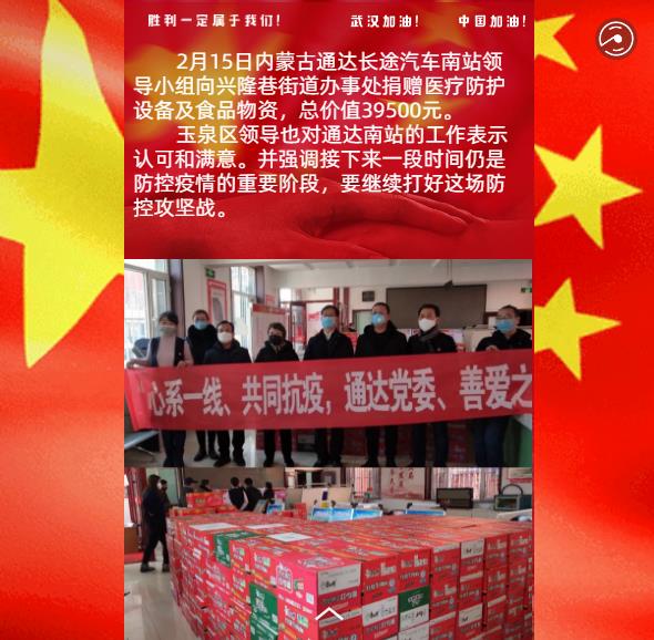 在新型冠狀病毒肺炎疫情肆虐神州大地之時,在這個特殊的時期里,每個人都卷入了一場特殊的戰(zhàn)役。在疫情當(dāng)前我們看到一批批勇敢的逆行者夜以繼日的堅守在一線崗位,保障著你我健康安全,守護者大家的生活秩序。內(nèi)蒙古通達實業(yè)股份有限公司強化責(zé)任擔(dān)當(dāng)、積極響應(yīng)、迅速行動,在做好各項防控措施的同時出資20萬元善款,通過全市多個轄區(qū)內(nèi)的街道辦事處進行愛心物資捐贈活動,以表達通達公司對奮戰(zhàn)在疫情聯(lián)防聯(lián)控一線的工作人員最崇高的敬意!