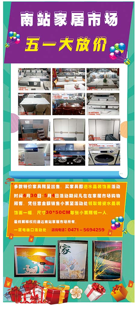家居市場"五一大放價"營銷活動,配合節(jié)日活動營造節(jié)日氛圍,場外空飄條幅布置,家居市場戶外樹立了6顆空飄氣球,渲染了節(jié)日氣氛,廣而告之的宣傳手段,一定程度上提升了市場活動的社知曉度! 會 場內(nèi)買贈有禮活動火熱進(jìn)行中。